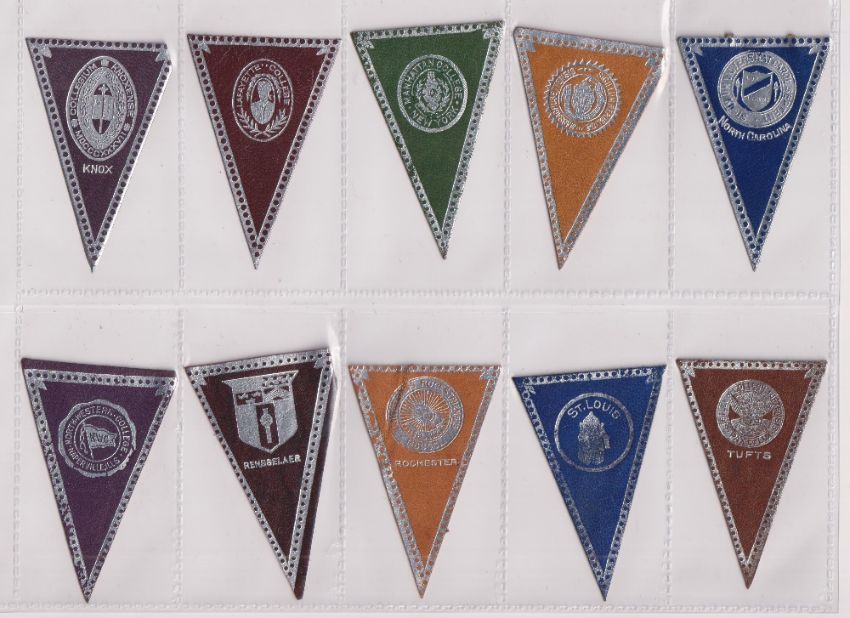 Tobacco leathers, ATC, College Seals, triangular pennant shaped, 40 different, two different printing styles (some with marks to backs, gen. gd)