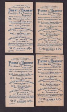 Cigarette cards, USA, Buchner, Musical Instruments, 'X' size, four cards, Arcadian Flageoletist, Coaching Horn, Hunting and Indian Cymbals (slight toning, gd) (4)