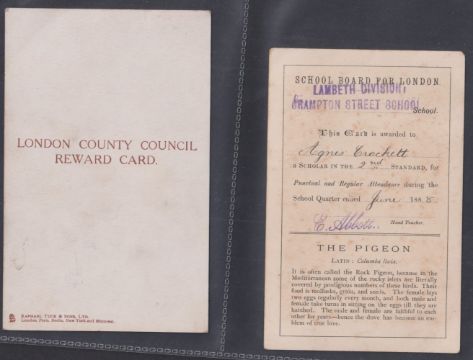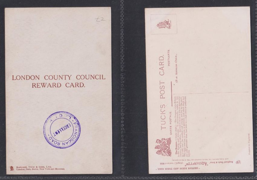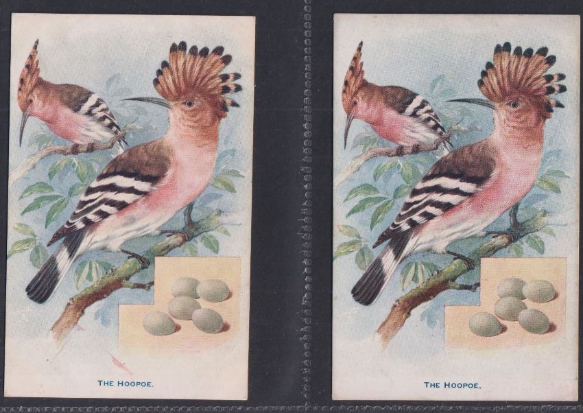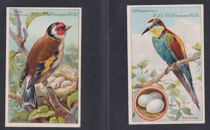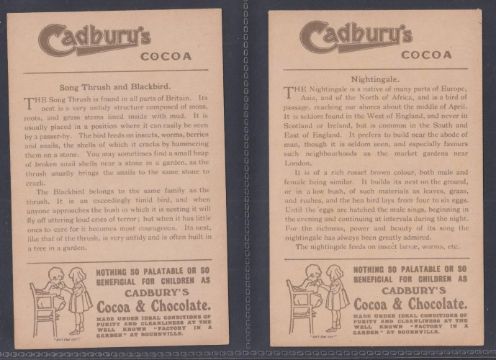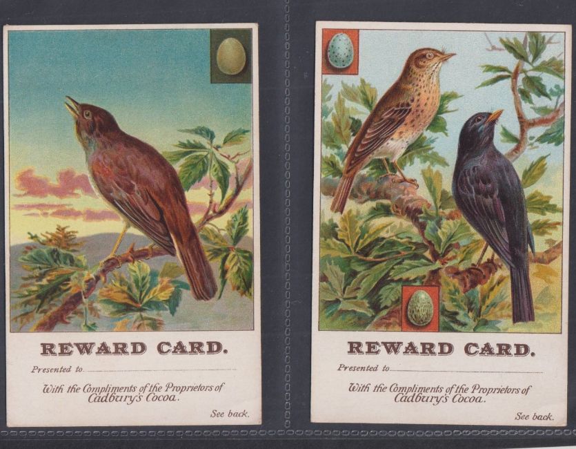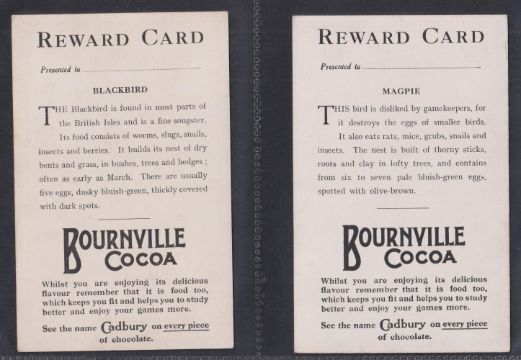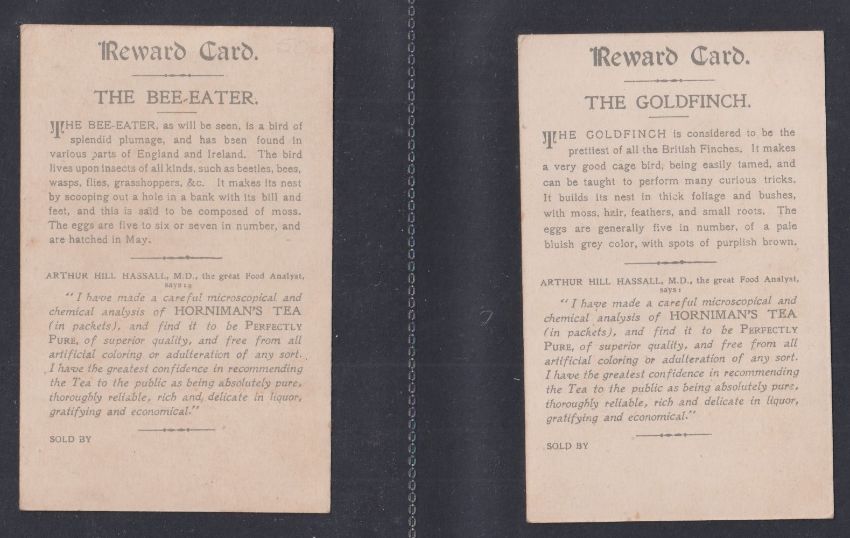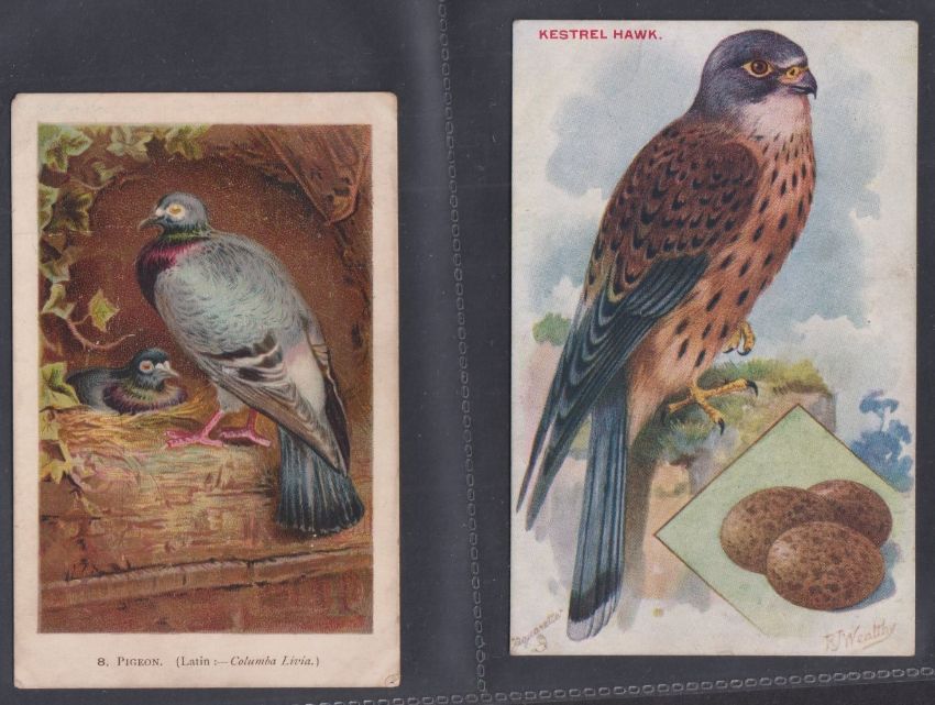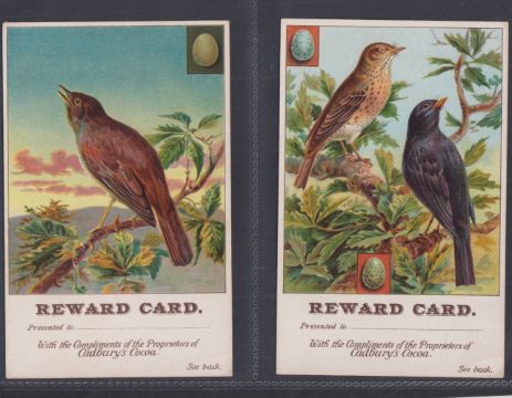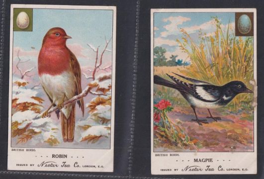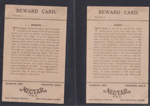 Trade cards, mixture 38 Reward cards, all Bird related P size Cadbury Black Printed backs (15), Nectar Tea (6), Cadbury Brown Printed backs (6), Horniman (2), London County Council (9, gen fair), plus 2 Tuck Postcards which have identical designs to the London County Council cards (gen gd a few fair unless stated above)