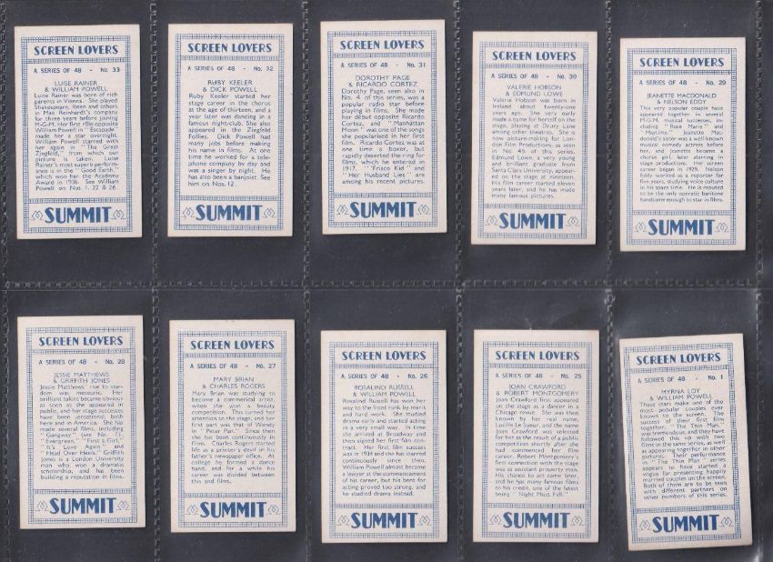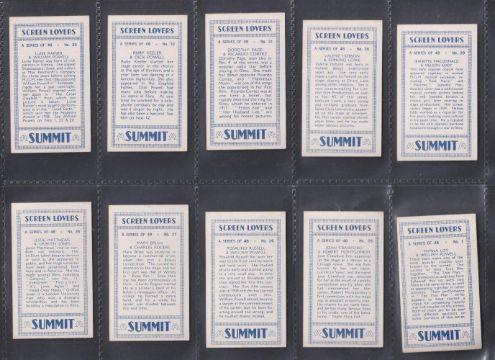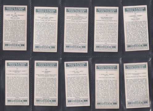 Cigarette cards, 8 sets all Cinema & Entertainment related, R Lloyd Cinema stars 2nd 28-54, Ogden's Shots from the Films, International Tobacco Co Summit Screen Lovers (1 card grubby), Carreras Glamour Girls L36, L&B Dance Band Leaders, Hill Music Hall Celebrities Std Size, P Jackson Shots from the Films, Wills Scissors Actresses (Green Border) (mixed gen gd unless stated above)