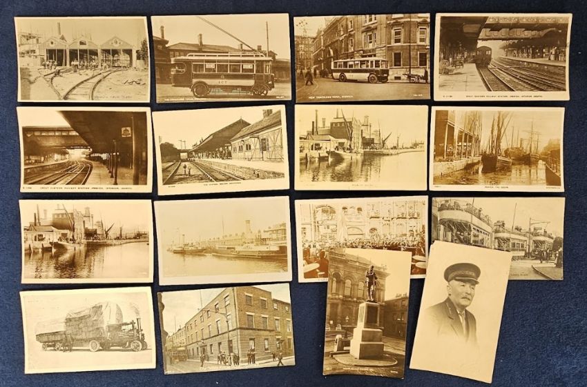 Postcards, Suffolk, a collection of 16 cards, with RPs of Ipswich Docks (3), River Orwell with paddle steamers, Station interior at Molton Constable, and Ipswich (North and South), trackless tram Ipswich (2), tram depot Ipswich, East Suffolk War Memorial, Ipswich Soldiers Memorial. Also printed cards of trams at Cauldwell Hall, and traction engine Warren Ipswich (mainly gd)