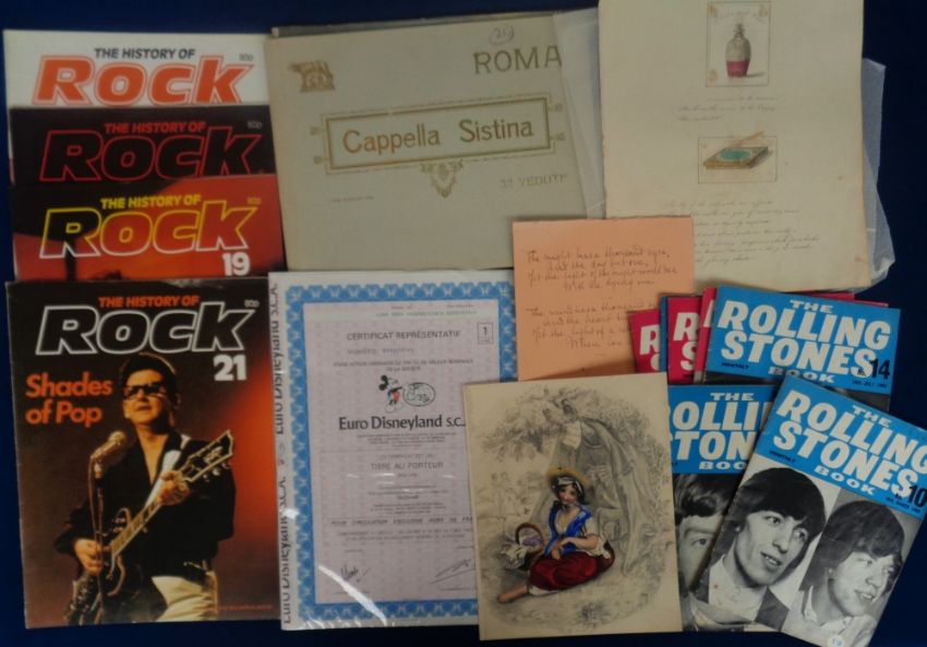 Ephemera, a large collection of assorted items to include a Kate Greenaway (?) large silk, Victorian scraps and cards, Paris Inonde 1916 (Art Nouveau booklet showing 32 images of the Paris Floods), a Bertram Mills jigsaw puzzle, 21 copies of The History of Rock magazine (1980s), a collection of match box lids and match books and much more (gen gd)