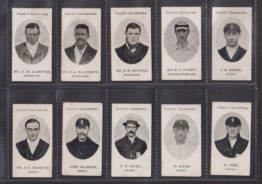 Cigarette cards, Taddy, County Cricketers, 20 cards, Derbyshire (3), Northamptonshire (1), Surrey (6 inc. Hobbs), Sussex (5 inc. Ranjitsinhji), Warwickshire (1) and Worcestershire (4) (all with slight marks / faults, fair/gd) (20)