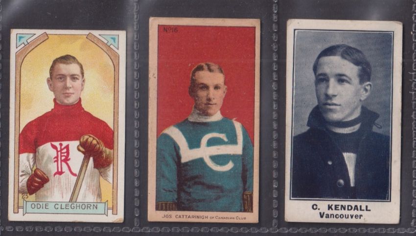 Cigarette cards, Canada, Anon (ITC, Canada), Hockey Series, three type cards, each with different backs, Odie Cleghorn, Renfrew, Jos. Cattarinigh of Canadian Club and C. Kendall Vancouver (gen. gd) (3)