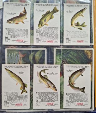 Trade cards, over 400 cards mainly Continental, all Fish / Sea themed. Including Coca Cola World of Nature subset VII (set 12 cards), Berliner Morgenpost Unsere Aquarium (set 27 cards G size), Anon French Language L sized cards (?set 24 cards), 4 milk creamer top sets by FloralP / KaffeeRahm, Part sets L sized cards by Editions Educatives Paris etc, Cowans Canadian Fish (4), Palmin, BonPoint, FrancoRusse, H Ringers, Verkade etc (mainly gd a few fair)