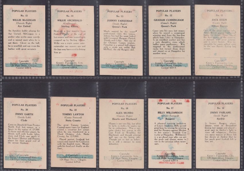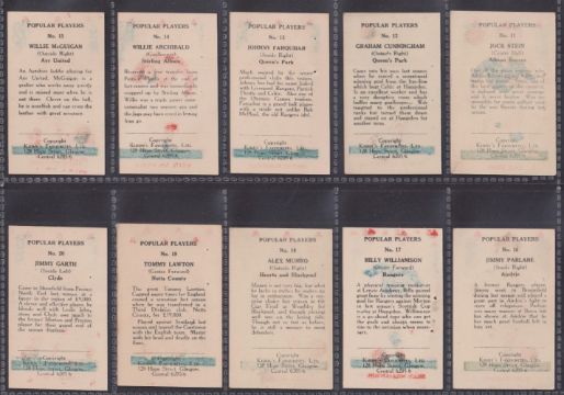 Trade cards, Kiddy's Favourites, Popular Players (Football) with red Shamrocks on front 51/52 missing no.44 (staple holes as issued, a few with rubber stamping on backs, all have some colour printing from the front showing on the backs, gen fair/gd)