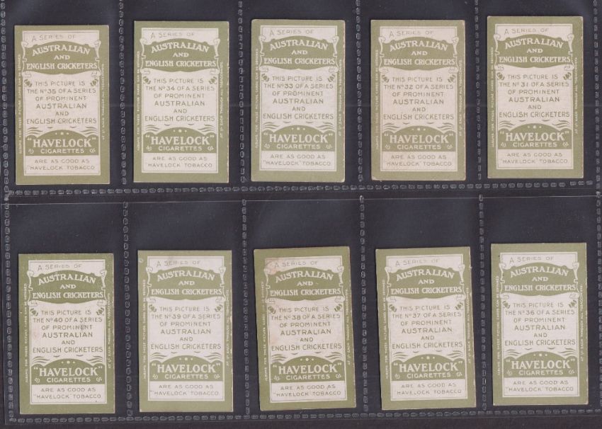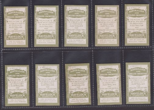Cigarette cards, Wills (Australia), Australian & English Cricketers (1-50, all Havelock Cigarettes backs) inc. Hobbs, Fry etc (set, 50 cards) (most with slight marks, one with slight back damage, fair/gd)