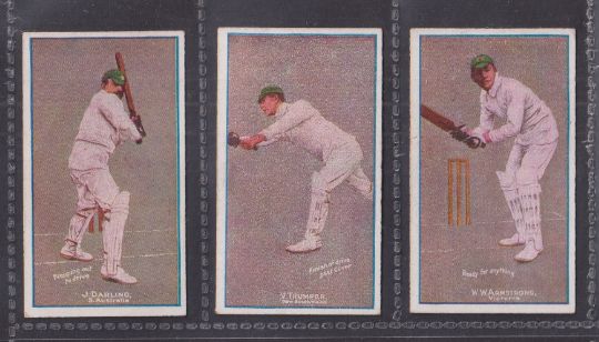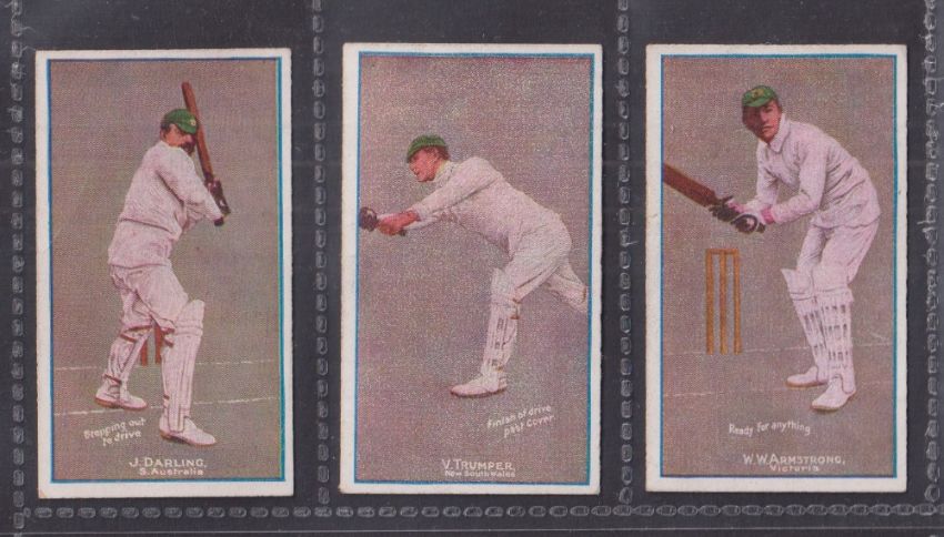 Cigarette cards, Sniders & Abrahams, Cricketers in Action, 3 cards WW Armstrong Vic (slight grubby back, near gd), J Darling SA & V Trumper NSW (both gd)