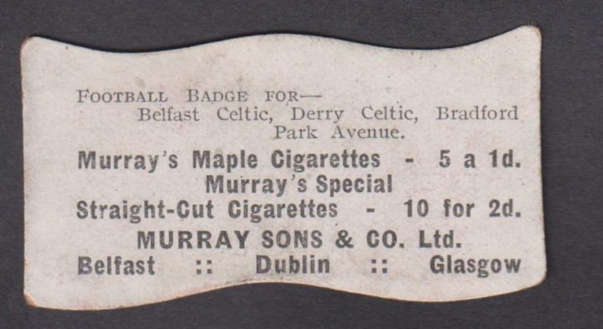 Cigarette card, Murray's, Football Colours (Shaped, Murray's Cigarettes), type card, Belfast Celtic/Derry/Celtic/Bradford Park Avenue (gd) (1)