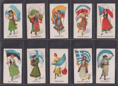Cigarette cards, JF Bell, Women of all Nations (printed backs), 15 cards Argentina, Bulgarien, Columbia, Costa Rica, Czekoslovakien, Estland, Finland, Frankrig, Graekenland, Honduras, Ostrig, Polen, Spanien, Ungarn, Wales (Polen card staining, rest near gd)