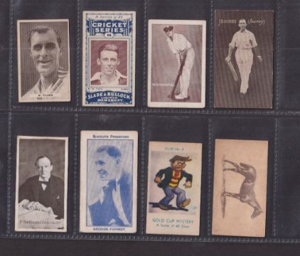 Trade cards, 8 scarce type cards, including Cricket & Horse Racing, Australian Licorice Co Cricketers 1928-29 J.B. Hobbs, Surrey, Sweetacres Sports Champions W. Tilden Tennis, Slade & Bullock Cricket Series no 14 Tate Sussex, Meadow Tea British Celebrities Rt Hon. Winston S. Churchill, Blakleys Productions Ltd (Manchester) George Formby advert card, Hoadley's Chocolates Gold Cup Mystery Cards (1), Griffiths Cricketers 1934-35 (1) W.M. Woodfull, Anon (Australia) & Well-Known Racehorses (1, no 2 Keysoe) (some slight faults, gen. gd) (8)