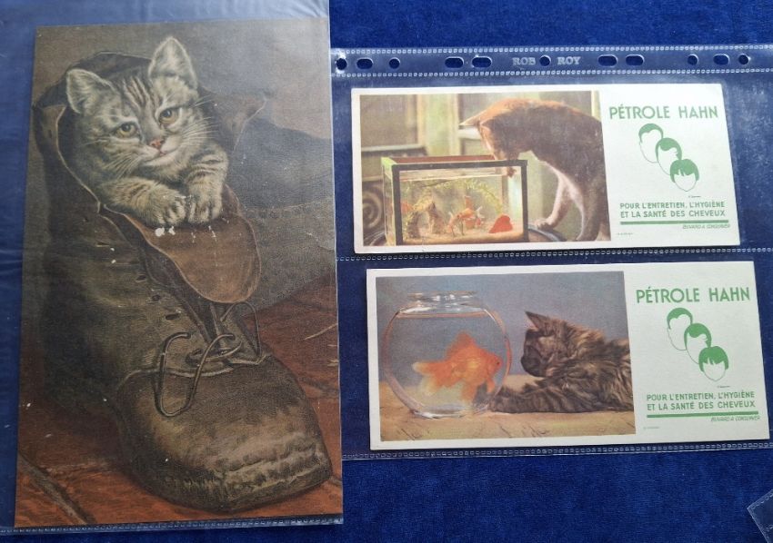 Trade cards, 20 cards, Cat related, A L Foster, Potages Chevet, Lambert Pianos, Au Bon Marche, Petrole Hahn, A few anonymous plain backed, Biscottes Luc, Chocolat Moreuil etc (fair/gd)