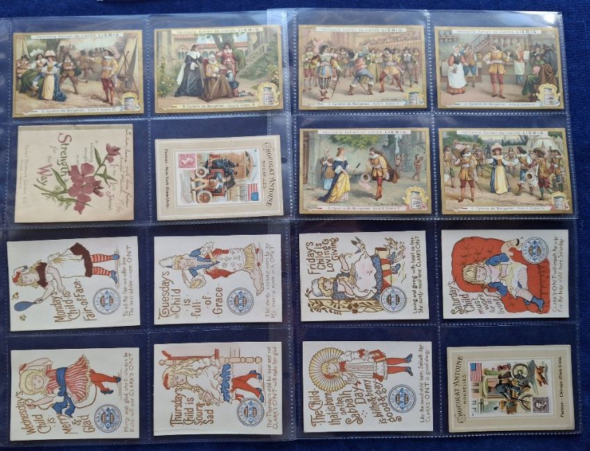 Trade cards, Approx 125 cards, very interesting selection, some scarcer series noted including Anglo Swiss Milk, Princess of Wales G sized card, Huntley & Palmer, Frys, Peek Frean, Johnstons Corn Flour, Holloway, Clarks Spool Cotton Monday's to Sundays Child cards (set 7 XL sized) The Scout, Melox, My Weekly, Purina, Robertsons Silver Shred etc (mixed gen fair/gd)