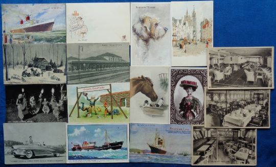 Postcards, a mixed selection of approx. 38 cards with shipping S.S United States, M.T Boston Arrow, American Line S.S New York, P.S Royal Eagle (5), S.S Stella D'Italia, R.M.S Mataroa, Farrell Lines 'African Enterprise'; glamour, motoring, advert for Evian Les Baines, pretty girls, Swiss advert for 'Sanatorium Universitaire', children, Drury Lane PC for Dick Whittington (2), dog, Italian Station interior, horse, gnomes, Cassiers etc. Nice lot (gd)