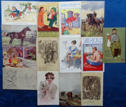 Postcards, a subject mix of approx. 30 cards, with comic (mainly Tom Browne) inc. Dutch, sentry, wrestling, Pierrots, Home Sweet Home etc (10), Thackeray, Podridge (anti Kaiser for Punch), Parkinson (Write Away), G.M Payne 'Stone Age' etc. Also silhouette (2), Phillimore, Harry Payne (3), glamour (Pannett, Patella, Peltier), and RP of Liner United States (mainly gd)