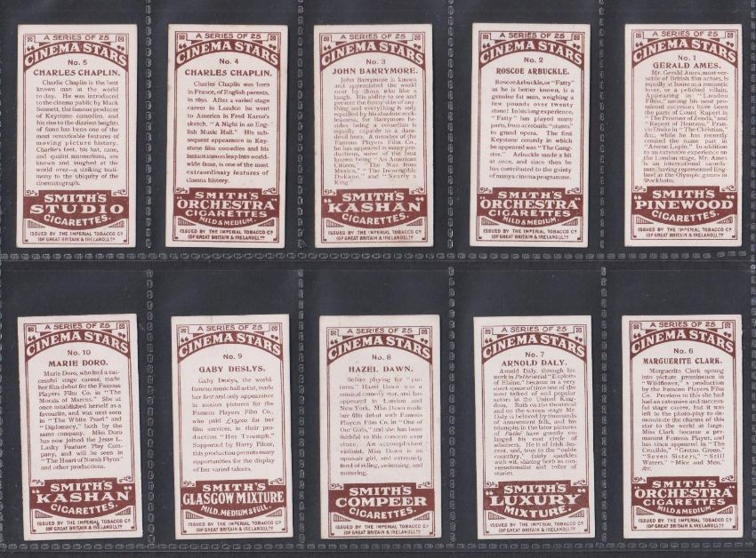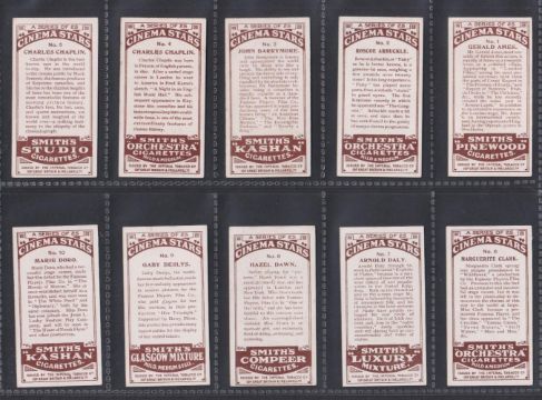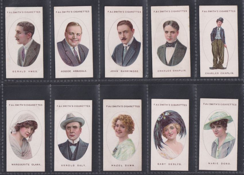 Cigarette cards, F&J Smith, Cinema Stars, multiple brand backs inc. two different Charlie Chaplin cards (set 25 cards) (gd)