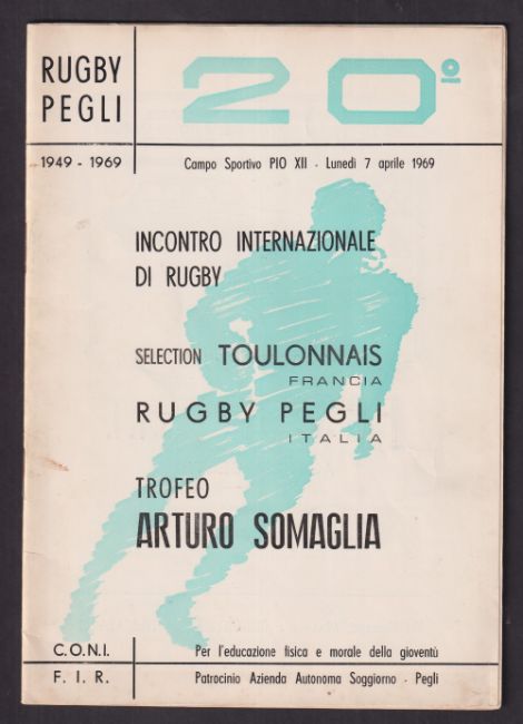 Rugby programme, Rugby Pegli (Italy) v Selection Toulonnais (France) scarce programme from the match played in Rome on 7 Apr 1969 (gd)