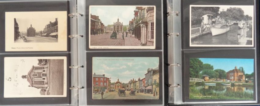 Postcards, Oxfordshire/Berkshire, a collection of approx. 115 cards of Oxfordshire and a few Berkshire in 2 modern albums. Includes Henley on Thames (77), Shiplake (36) and Wargrave (2). RPs include Station Rd Shiplake (Collier), Thames view Shiplake, Shiplake Lock (Collier), Shiplake Church (2, Collier), also a few printed cards. RPs of Henley inc. aerial views (2), Hart St (many), Parish Church, White Hill (2). Also many different views of Hart St (printed) and the church (mixed condition)