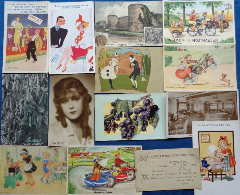 Postcards, a mixed selection of approx. 34 subject and a few UK topographical cards, inc. applique, pullouts, greetings, Mickey Mouse, Empress of France (RP), Cadburys, Suttons, Chivers adverts, Thornton Heath Station interior (printed), village forge Woodley (Collier), The Lodges Basildon Pk (Collier), Chaplain's House Goring Heath (Collier), motorcycle comic (3), illustrated cards of children, comic, Phillimore, clowns etc. Nice mix (mainly gd)