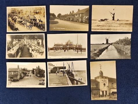 Postcards, Norfolk, a collection of approx. 25 cards, with RPs of Old Sea Palling, Hunslett Mill Stalham, Kings Lynn fair (2), market day Dereham, Wharf Kings Lynn, Kings Lynn tea given by Mayor & Mayoress in Grand Avenue of the Walks, Thorpe Stn exterior, Royal Procession Tombland Norwich, The Street Helhoughton (2), Parker's Corner Dersingham, White Hart St Thetford, Creake Green. Also printed card of P.O Swanton Abbot, Coltishall St etc. Good mix (mainly gd)