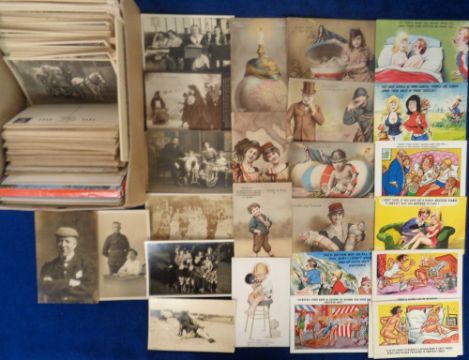 Postcards, a remaindered collection of approx. 180 loose London Life cards published by Charles Skelton (printed) numbered 1-12, also with 6 sets of 12 (5 sets of o/p). Sold with 36 social history cards, mostly RPs of groups, dogs, car, pram, mower, deckchairs etc. 34 modern comic (Bamforth, Pedro, Taylor), and 49 remaindered French Patriotic (7 different images). Over 300 cards (mixed condition)