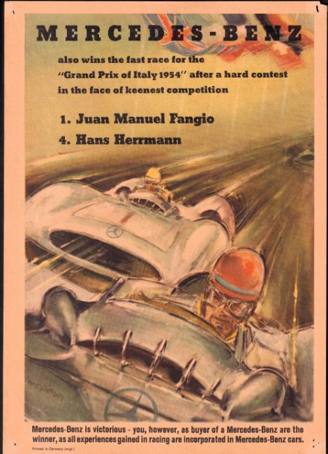 Motor racing, a Mercedes-Benz promotional poster showing the results of The Italian Grand Prix 1954 won by Fangio, and confirming Mercedes-Benz cars were placed in positions 1st and 4th. These were believed to be issued by Petrol Stations in the USA, 30cm x 21cm, scarce (pin-holes to edges,& some very sl paper loss to 1 corner otherwise gd)