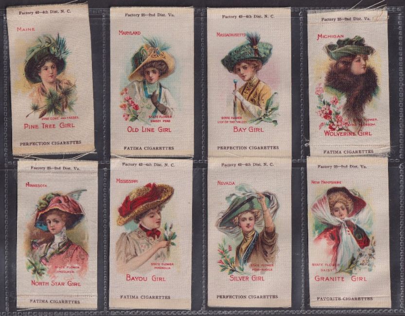 Tobacco silks, ATC, State Girl & Flowers, 'L' size, mixed Factory numbers & brands (set, 25 silks) (gd)