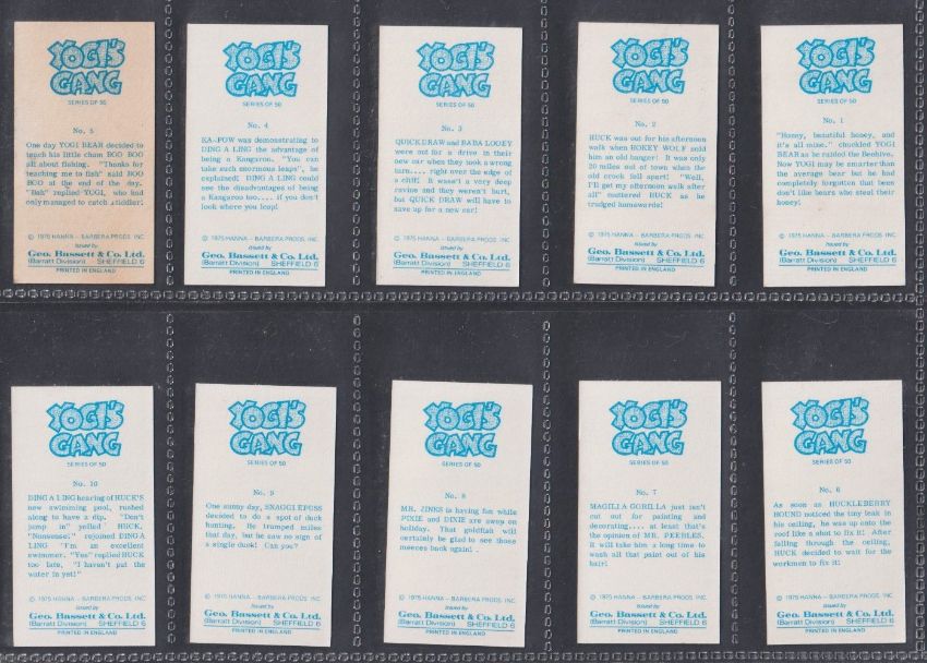 Trade cards, Bassett, Yogi's Gang (set 50 cards) (no 5 the scarcer number is heavily toned on the back and is a cream / brown colour, rest gen vg)