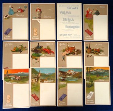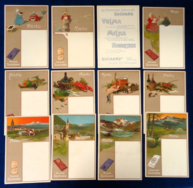 Trade cards, Suchard, Menu Cards, General Scenes IV, 185mm x 125mm (set, 12 cards) (all unused, gd/vg)
