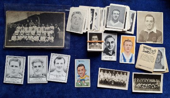 Trade cards, Football, Small mixture including A&BC Gum Footballers joined pairs (40, cut into singles), K size photographic footballers (26, mainly Thomson), Barratt Famous Footballers non descriptive (3, gd/vg), Reddish Maid International Footballers no.5 Pele (toning on back), Barratt A8 Denis Law (gd), Barratt Giants in Sport Billy Wright (gd/vg), sold with an unidentified RP Postcard Football Team (fair condition only) (gen fair/gd unless stated above)