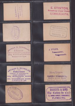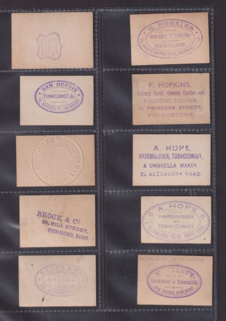 Cigarette cards, Ogden's, a collection of 50 cards, mostly Guinea Gold issues, each one with a Tobacconist or other retailer rubber stamp to back inc. Brock & Co, A. Hope, G. Hoskins, Will Maggs, W. Kippax, Arthur Reynolds, Roberts & Sons, William Windsor, Themans & Co, Wm. Drapkin, J.C. Martindale etc (gen. gd) (50)