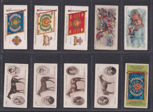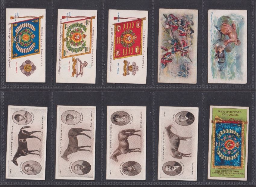 Cigarette cards, Mixture 54 cards Churchman Regimental Colours Cap Badges (13), Smith Derby Winners (4), Wills Australia Cricket (3), Churchman Boy Scouts (3), Gallaher Tricks Puzzles Green (5), Player Old England Defenders (1), Clarke Butterflies (4), Carreras Flag Dominoes (10) etc (gen gd / better a couple fair)