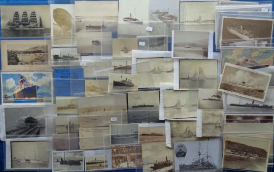 Postcards, Shipping, a collection of over 100+ shipping cards and photographs (small/medium format) of mostly liners and merchant ships. Includes SS Mantua, Malwa, RMS Aquitania, SS Minnetonka, SS Egypt, Empire Fowey, RMS Orcades, Turbine Biarritz, SS Benalla (all RPs), RMS Newfoundland, RMS Aurania, SS Doric, RMS Moldavia, SS Mongolia, SS Laurentic, Turbine Letitia (a few cards with adhesion to reverse o/w mainly gd)
