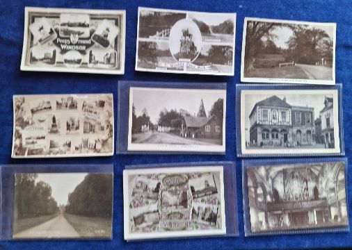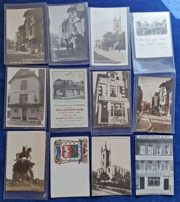Postcards, Berkshire, Windsor, 40 cards, RPs, printed and a few artist drawn, to include shop fronts, The Ruins of a Fire at Windsor April 1907, Royal Centenary Show in the Windsor Great Park, pubs, Squirrel Hotel, military band, Combermere Barracks, Funeral of Edward VII, Bethany Ward St. Andrews Hospital Clewer, Peascod Street, Church Street etc. (gen gd)