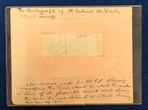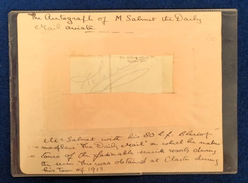 Postcards, Early Aviation, Henri Salmet, 4 cards to comprise 'The Daily Mail Aeroplane Tour 1913 M Salmet and his 80 HP Bleriot Monoplane', signed to the reverse, obtained at Clacton in 1913. Laid down on paper with a window cut out to show signature, a signed card of the aviator in his plane, 1912 souvenir card of a visit by Salmet to the 'West Countree' and a card of the aviator standing beside his plane before a crowd (gd)