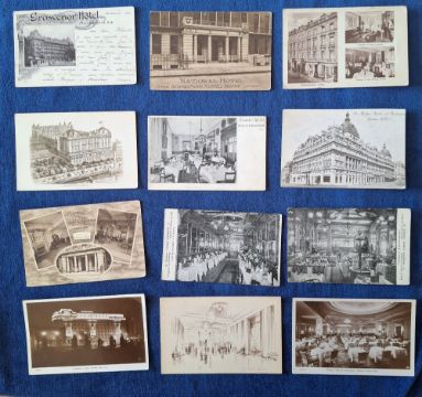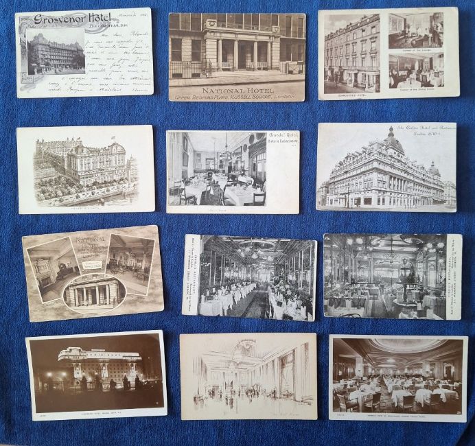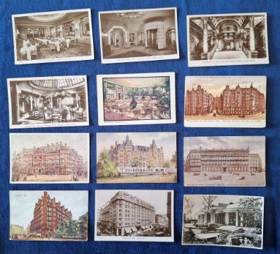 Postcards, London, mainly Hotels a few Shops, 39 cards, mostly exterior, a few interior. Many attractive coloured examples, including Metropole Hotel, St Ermin's Hotel, Waldorf Hotel RP, Grosvenor Hotel, Debenhams new Premises, First Avenue Hotel, Dorchester Hotel RP etc (gen gd a few fair)