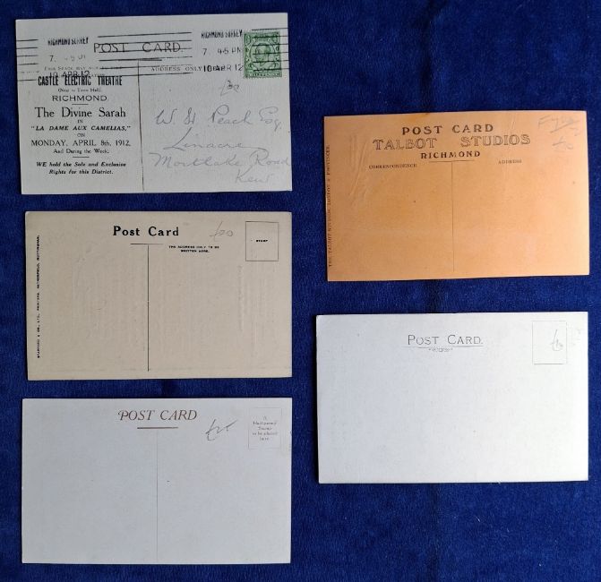 Postcards, Surrey, Social History, Local Richmond Surrey interest, 5 cards, Hugo Sharpley, Headmaster Richmond School Portrait, Talbot Studios Richmond produced RP Postcard showing 4 ladies looking at a Postcard album, Mme Sarah Bernhardt Actress Card with Castle Electric Theatre Richmond advert on back, Richmond Theatre 'Island Princess' Poster advert, 'Beautiful Richmond' Prize Poster issued by Richmond Town Advancement Association (gd)