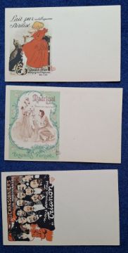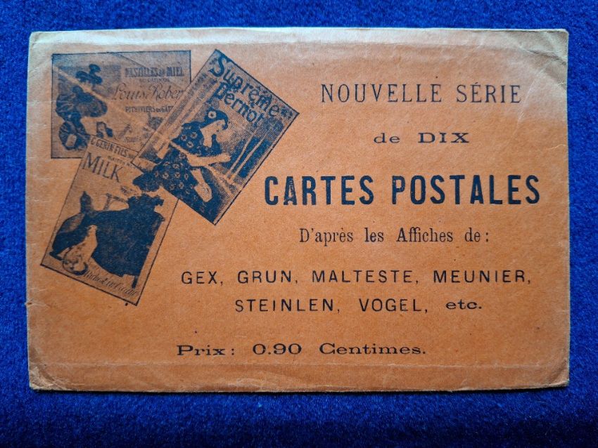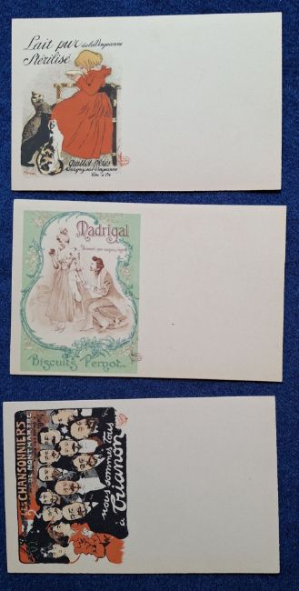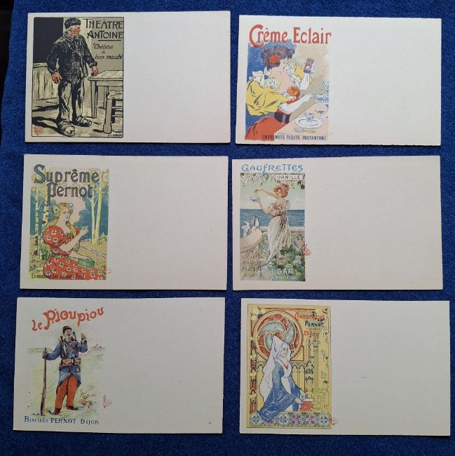 Postcards, Advertising, 9 Advertising Postcards, reproduced from posters, French including Supreme Pernot Biscuits (5 different), Theatres (2 different), etc. Most artist signed, including A Steinlen, L Malteste, G Gex etc, sold with an original paper packet that some of these were issued in (the 9 cards probably are from similar but slightly different series) (cards unused gd. packet some wear, fair)