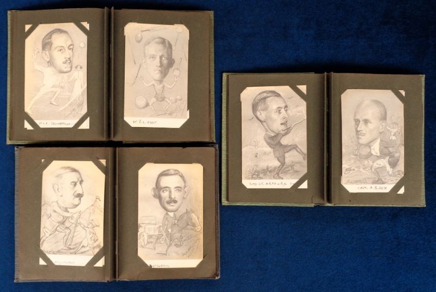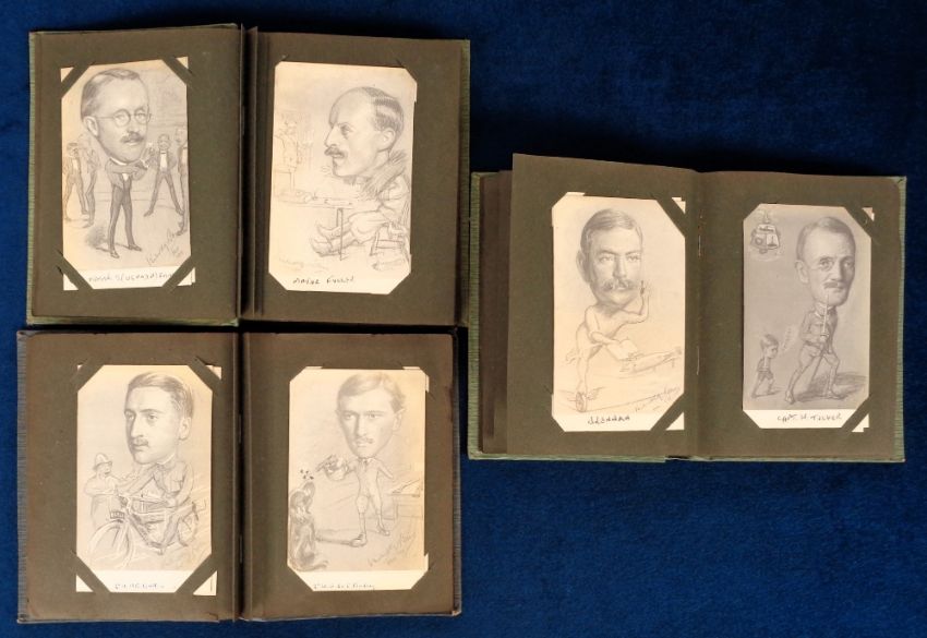 Postcards, 3 small albums of army caricatures drawn by H. Allen circa 1912, the originals of which were hung in the Billiard Room R.E Mess Chatham. Highly accomplished sketches hand annotated with the name of the subject and many signed by them. May be a set of 50 - Lot contains several duplicates approx. 150 in total (gd)