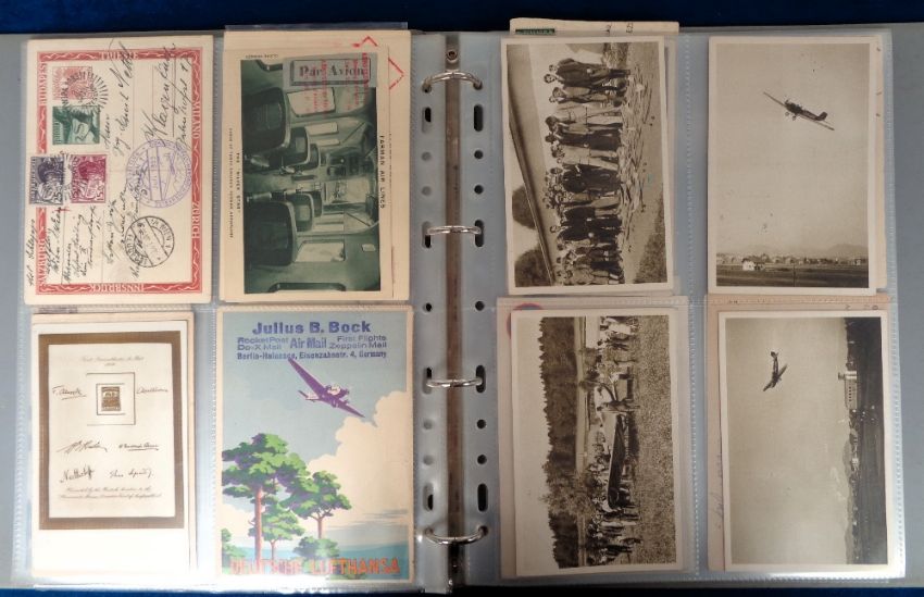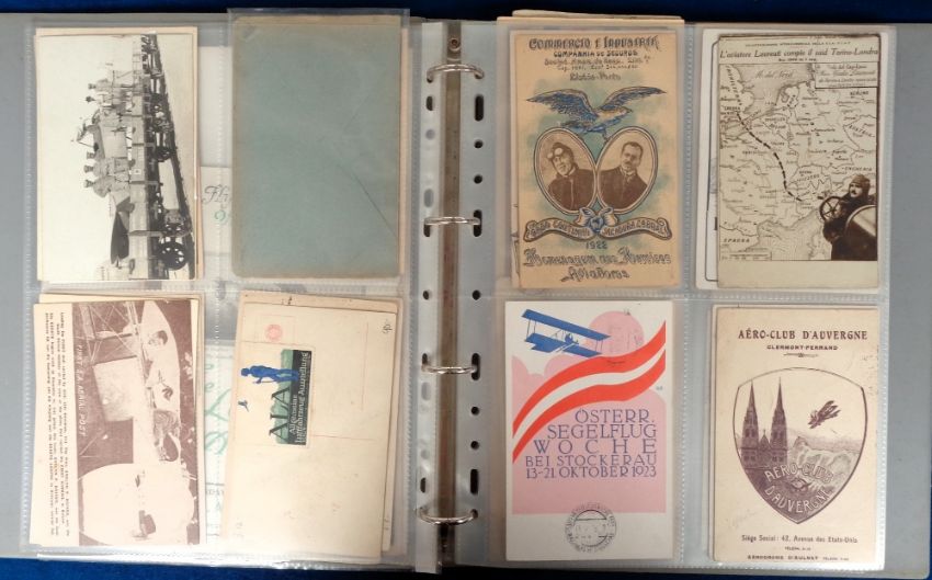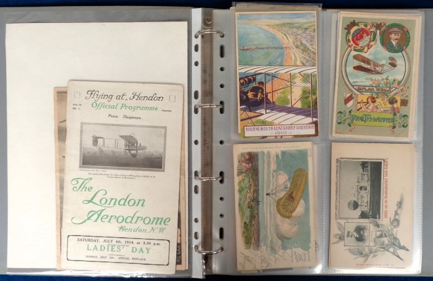 Postcards, Aviation, 55+ items to include postcards, envelopes and a few photographs relating to aviation to include WW1 Feldpost, 1910 Bournemouth Centenary Souvenir postcard, 1918 RAF Ariel Postcard, images of hot air balloons, air ships etc. 1899 - 1960s. Together with a 1914 London Aerodrome 'Flying At Hendon' Programme and a 1937 German Glider Competition programme (gd)