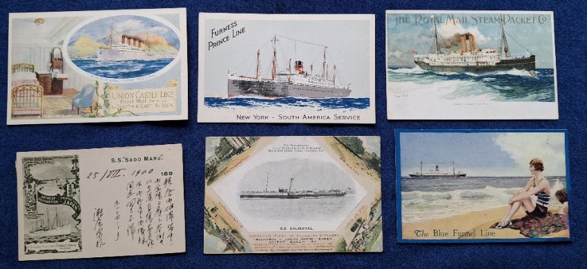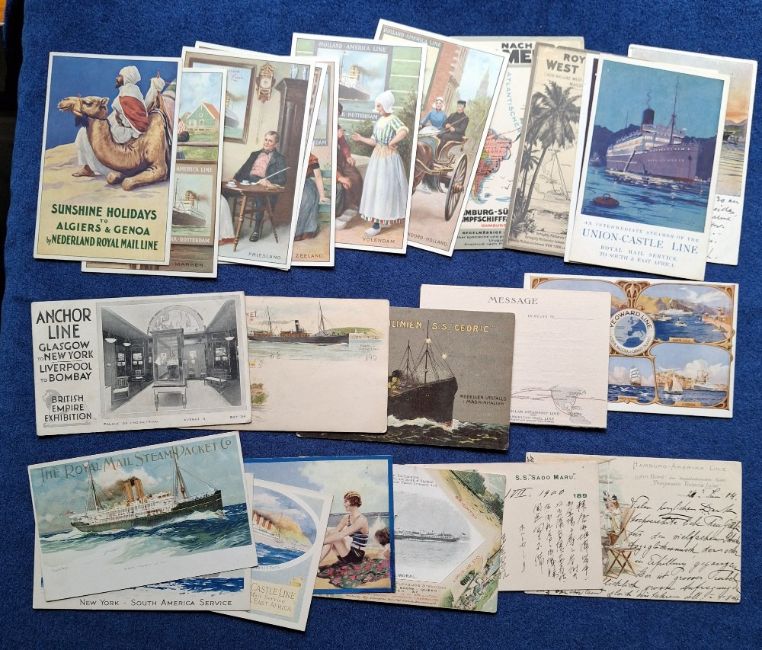 Postcards, Shipping 24 cards mainly Shipping Line Advertisement Cards, many Lines represented including Union Castle (2), Furness Prince, Blue Funnel, Royal Mail Steam Packet, Nederland Royal Mail Canadian Pacific, Dollar Steamship, Yeoward, Holland America etc (mostly unused, a few used, a couple fair gen about gd)