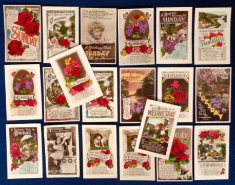 Postcards, Days of the Week, 39 cards Monday to Sunday, flowers, houses, children, dogs etc (gd)