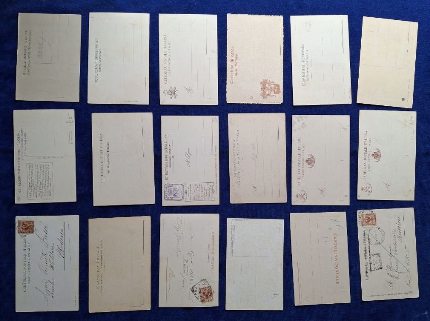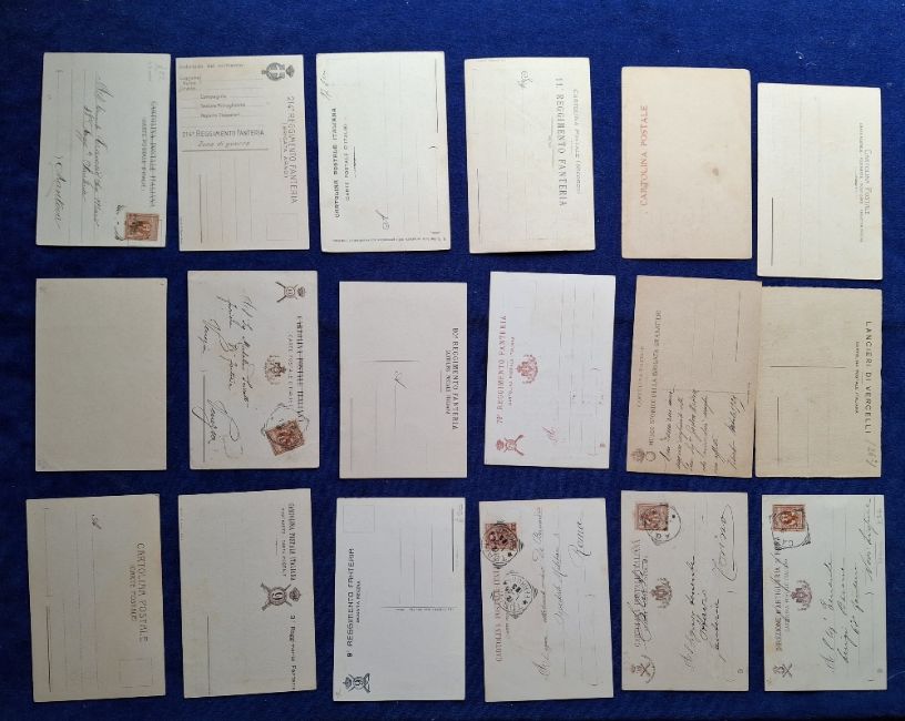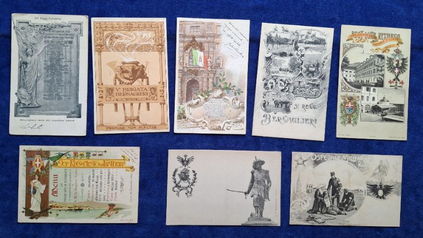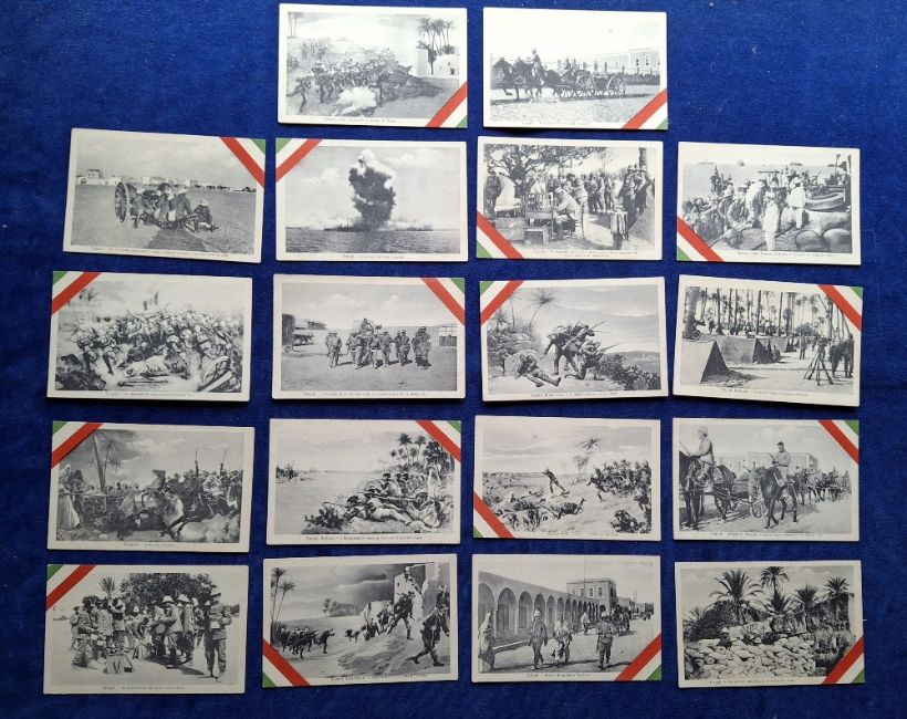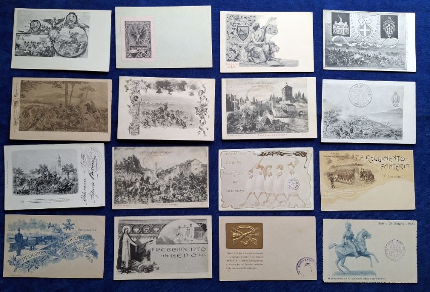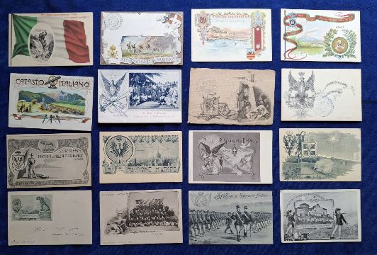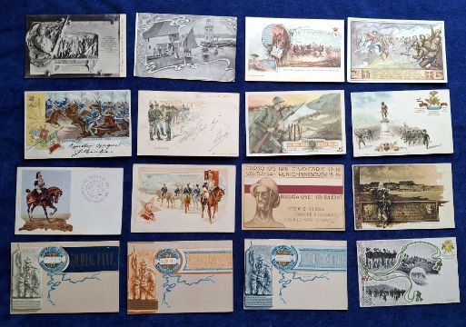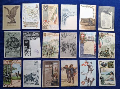 Postcards, Military, 110 Italian cards, covering a range of Militaria topics including Regimental Crests & Battle Honours, Colour printed Battle Scenes, Patriotic etc, many cards artist signed etc (gen gd a few fair)