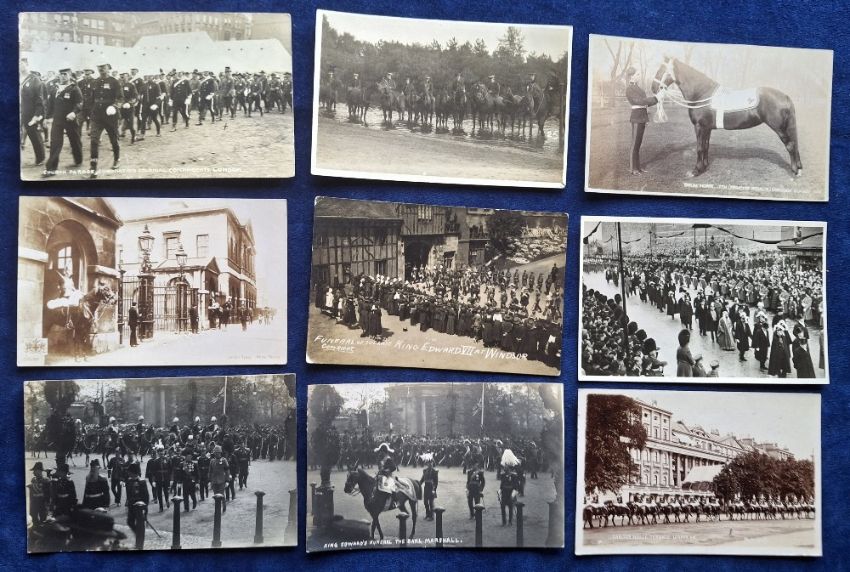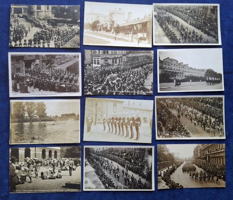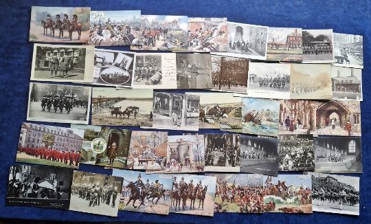 Postcards, Military, a selection of approx. 100 cards to include Japanese Minister's Visit to the Royal Hospital Chelsea, Generals Inspection 2nd Life Guards, Funeral of King Edward VII, Drums & Fifes 1st Coldstream Guards Windsor Castle, Colonial Coronation Contingents Camp, Duke of Yorks School London (several), swimming horses and more (gen gd)