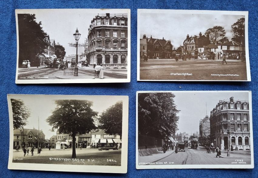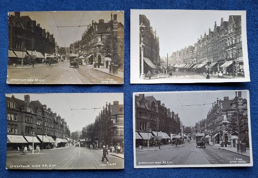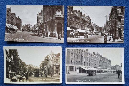 Postcards, London Suburbs, 15 cards all RP's of Streatham High Rd, all different many showing rows of shops and transport (trams, delivery vehicles), including Delivery vehicle for improved new milk delivery Streatham High Rd. Photographers mainly card House & John's (gen gd)