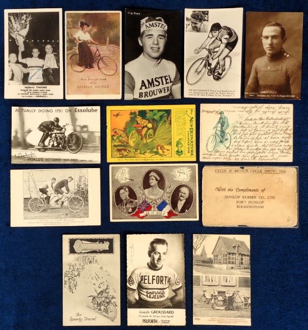 Postcards, Cycles and Motorcycles, 32 cards, mainly advertising cards to include the New-Departure Coaster Hub, Royal Enfield, New Knight, Larminach and Raleigh bicycles, Lambot Firmin cycle races, Tour de France 1907 and 1912, Frits Pirard, tandem etc. 1 Cecil Aldin illustrated (gd)
