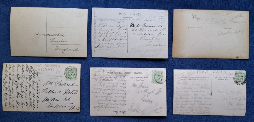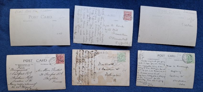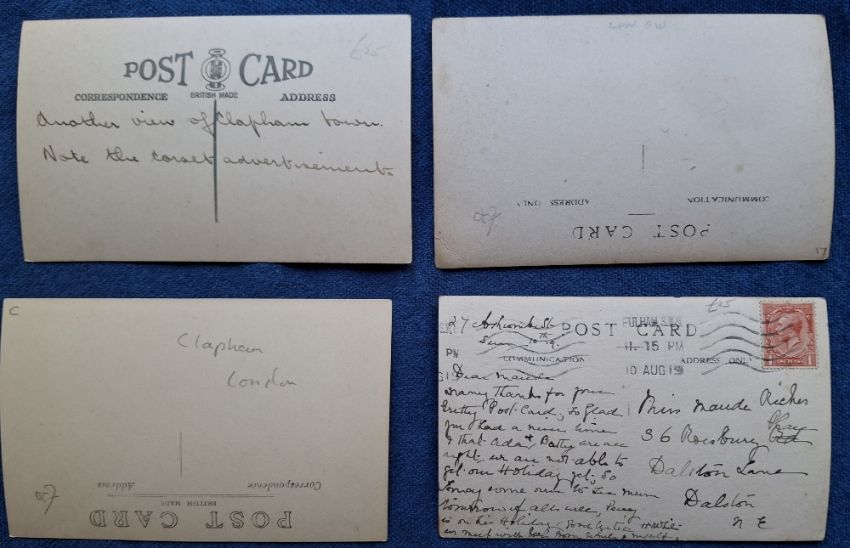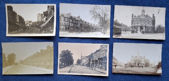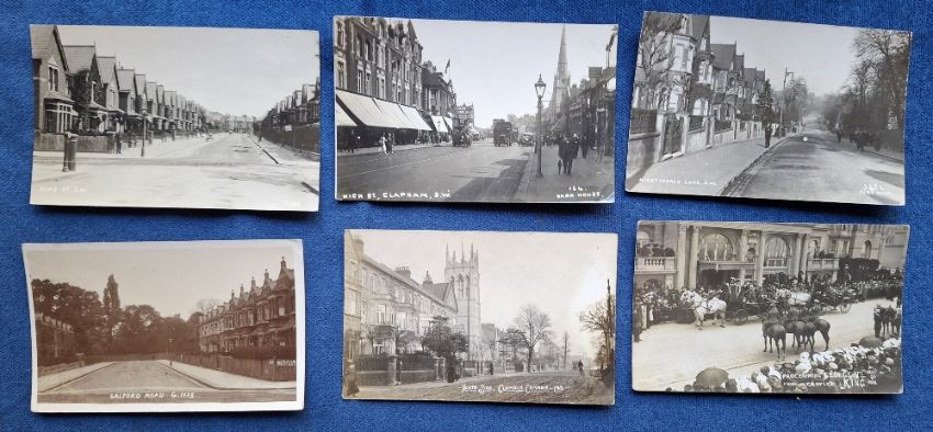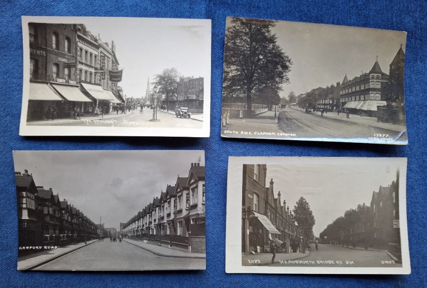 Postcards, London Suburbs, 25 cards all RP's of Wandsworth & Clapham. Wandsworth cards include Wandsworth Common, High St, Council House, Trinity Rd, Waynefleet St, Geraldine Rd, Cromford Rd, Bridge Rd (2), etc. Clapham cards include North Rd, South Side, Canford Rd, The Payemont, The Common, Clapham Junction, Nightingale Lane, High St, Elms St, Salford Rd North Side etc (gen gd)