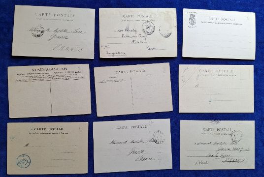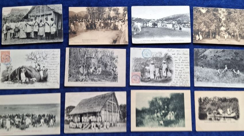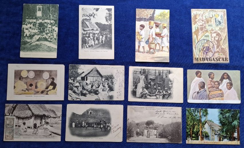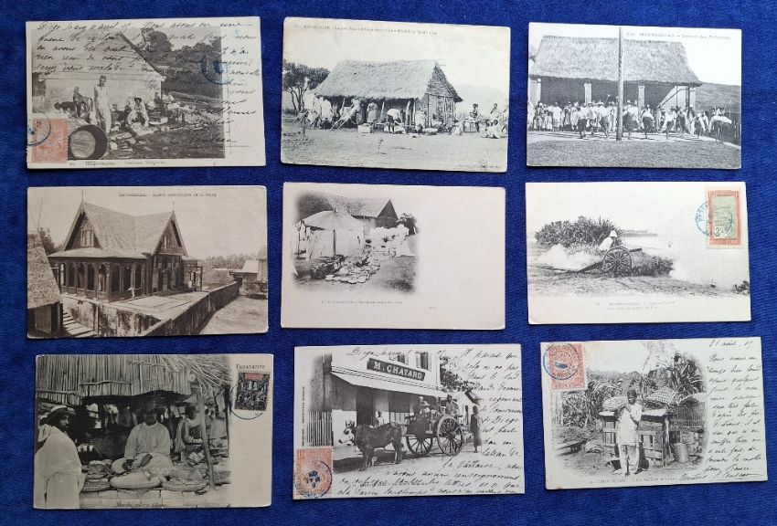 Postcards, Madagascar, 54 cards including many interesting Social History cards, noted are Firing Cannon Tamatave, Rice Market Tananarive, Horse Drawn Carriage Diego Suarez, Gateaux Seller Diego Suarez, Beauty Contest Nossi Be, Mattress Market Zoma, Street Scene with Handcard Tamatave, Market Tananarive, Arrival of Mail Carrier Diego Suarez, plus a few unidentified locations including Children Dancing at School, Working in Rice Fields, Missionaries in Countryside Building a House etc, many postally used (fair/gd)
