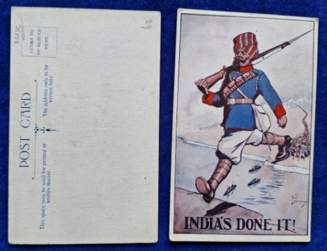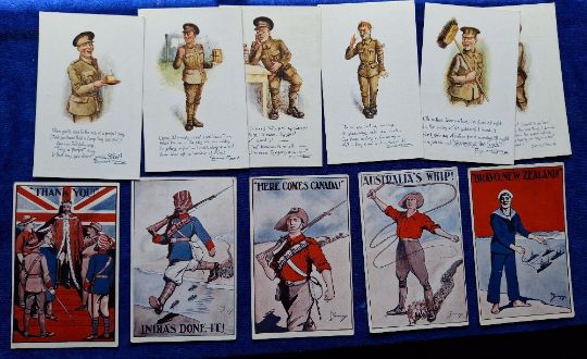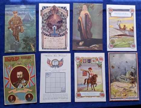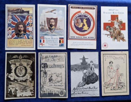 Postcards, Military / Patriotic, 33 cards including Roll of Honour God Save the King card (Russian issue), Commonwealth Heroic Artist Signed cards (5), Ward Lock United Empire Series (2), Inland Water Transport Advertising cards (postcard sized, plain backs, 3), Photochrom Hayward Young artist signed (set 6 cards), Help the Italian Red Cross, Royal Flying Corps RP, Greetings from 44 Squadron RP, Belgian Canal Boat Fund, Work of the Silver Thimble etc (gen gd a few fair)