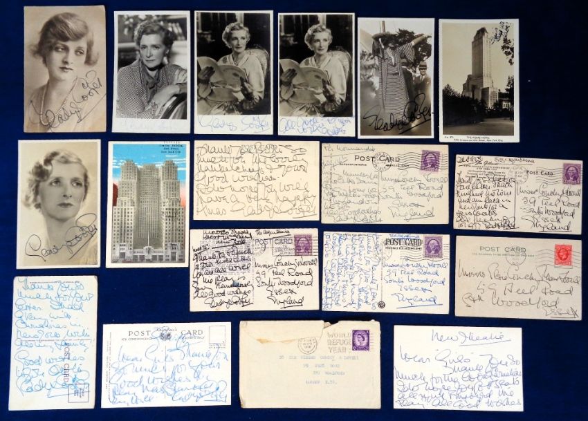 Postcards, Gladys Cooper Actress, a collection of signed (approx. 20) and unsigned (approx. 100) postcards, plus a small collection of other items including many of the handwritten envelopes that the cards were sent in. Most signed cards contain a message to the same recipient (gen gd)